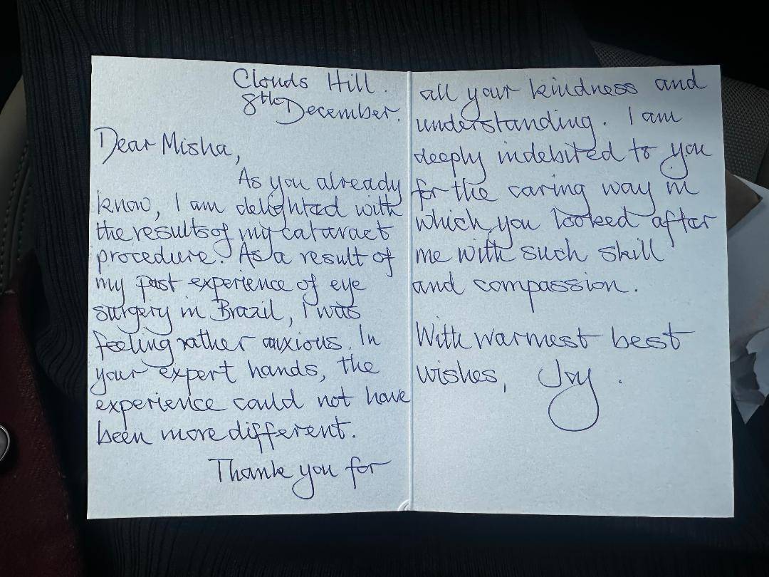 The ability which you have given me to be able to see well is life changing for which I will always be grateful (and explains the stupid grin on my face!). Misha your winning combination of being a highly skilled surgeon and a lovely caring personality is just simply wonderful. I just knew my eyes were in safe hands. Please also pass my thanks to Hilary and your surgical team (especially the hand holding Emma). Forever Grateful.