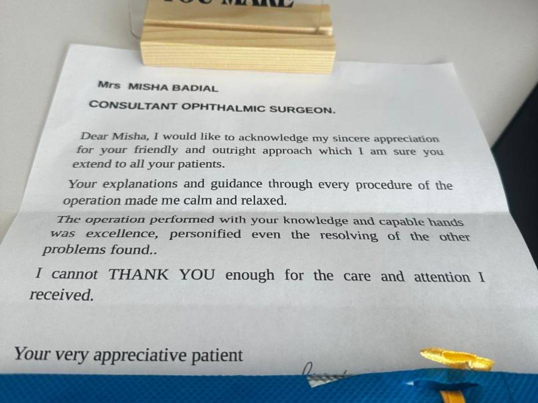 Thank you so much for the two successful operations you carried out on my eyes this last few weeks. Also the care and attention was beyond the call of duty.